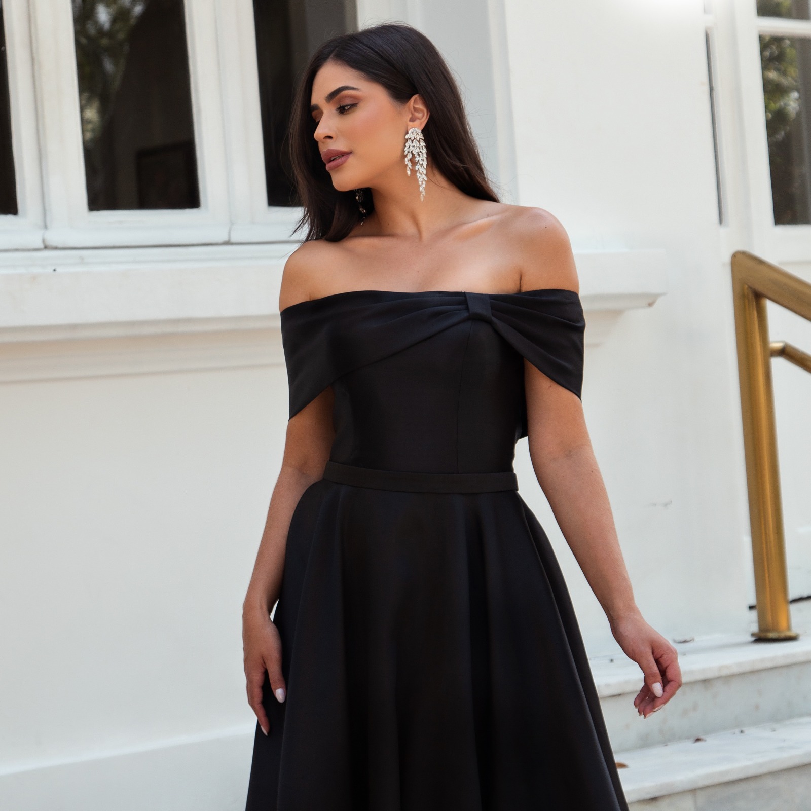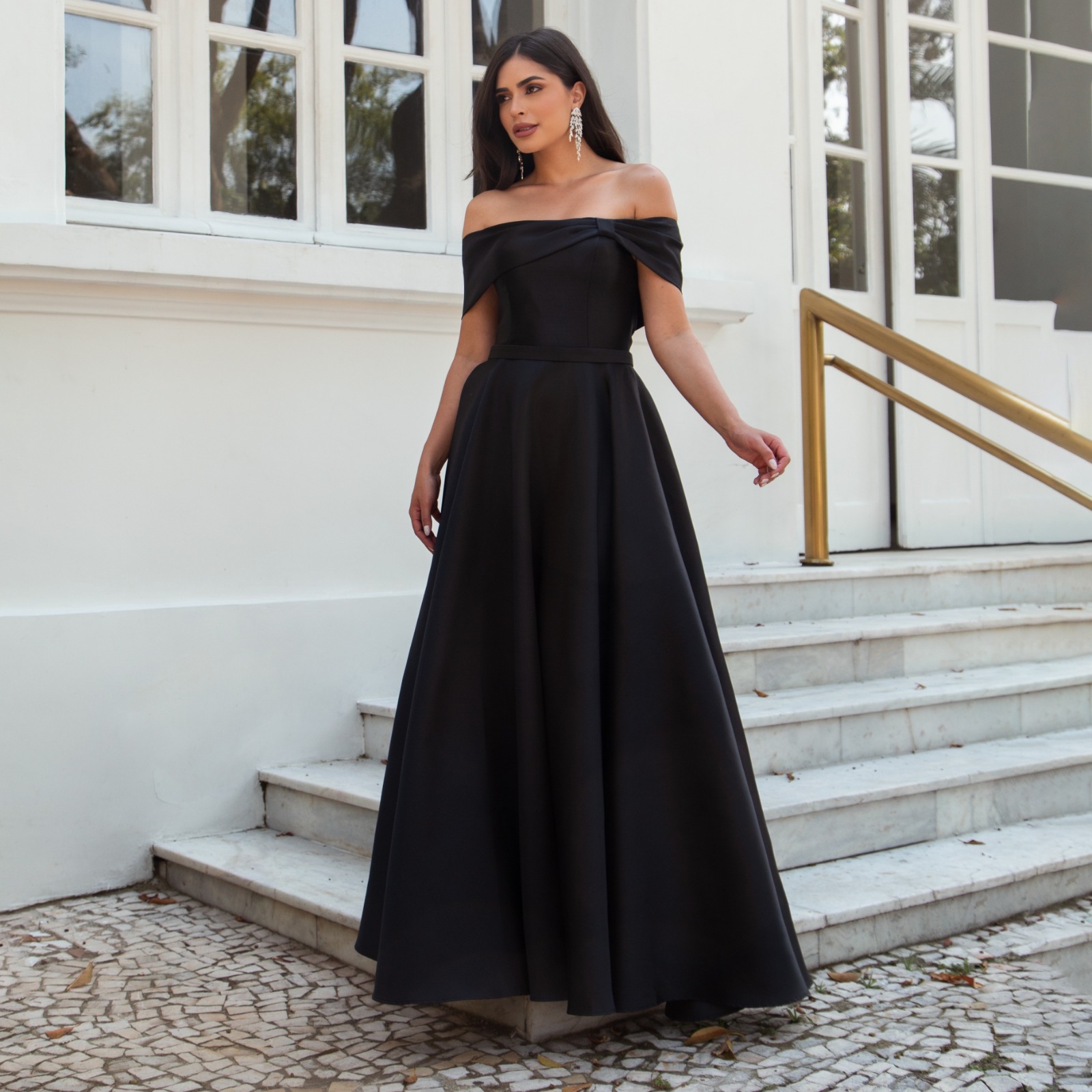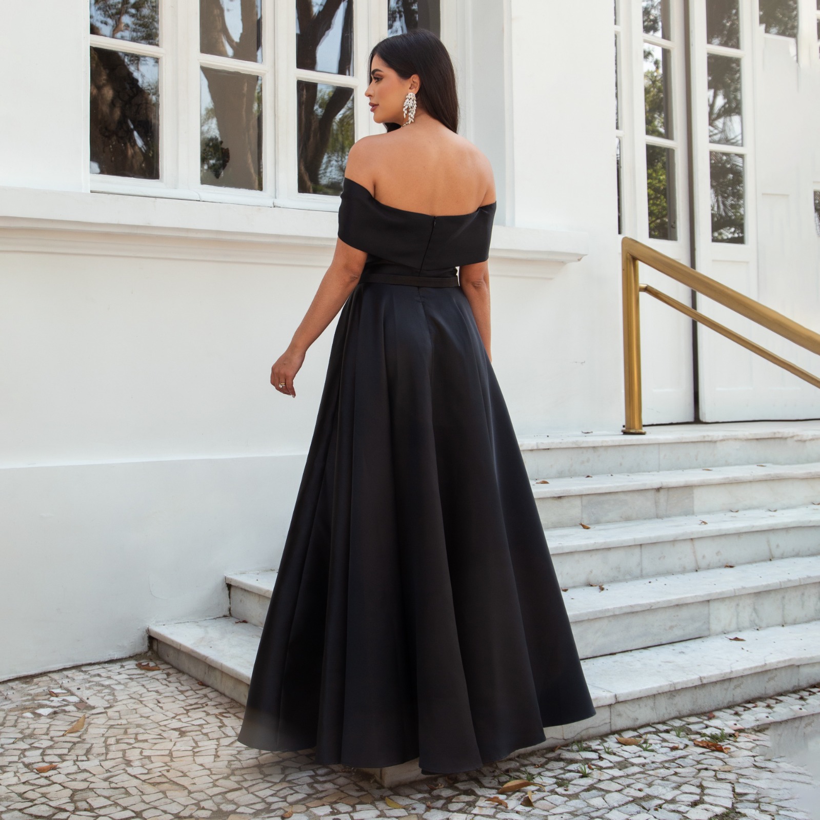 Vestido Kallina Zibeline ombro a ombro e saia rodada