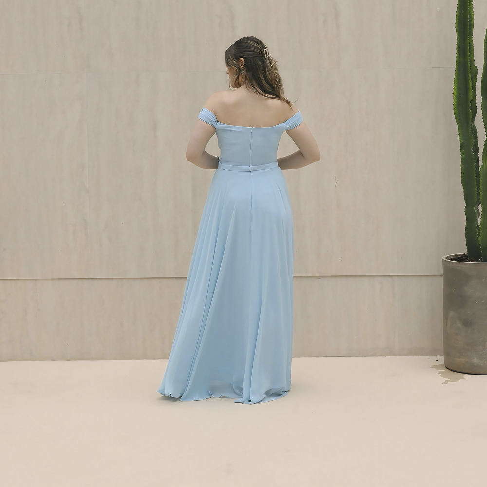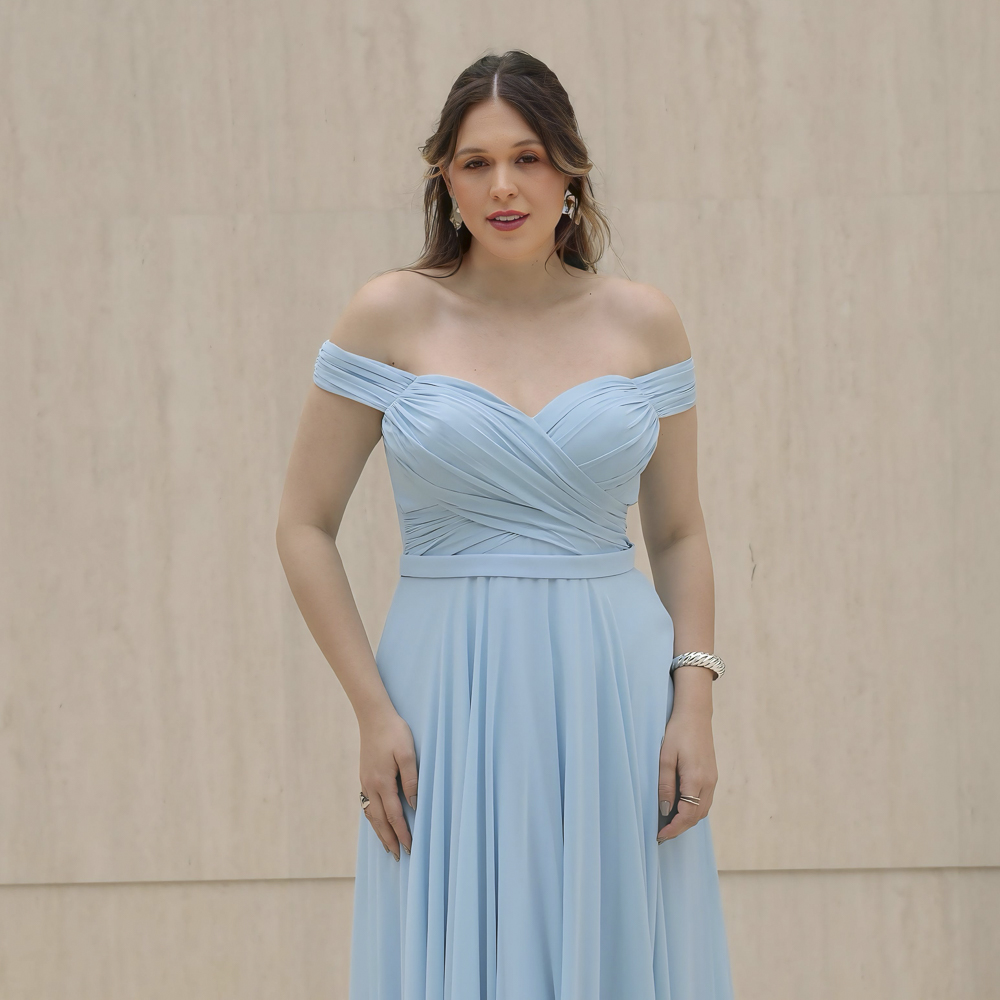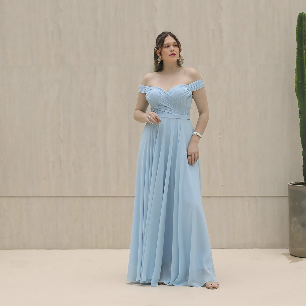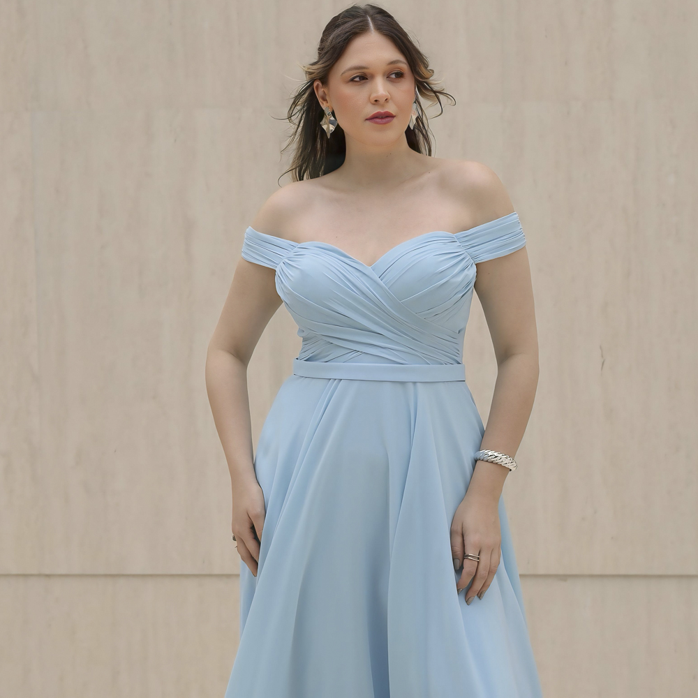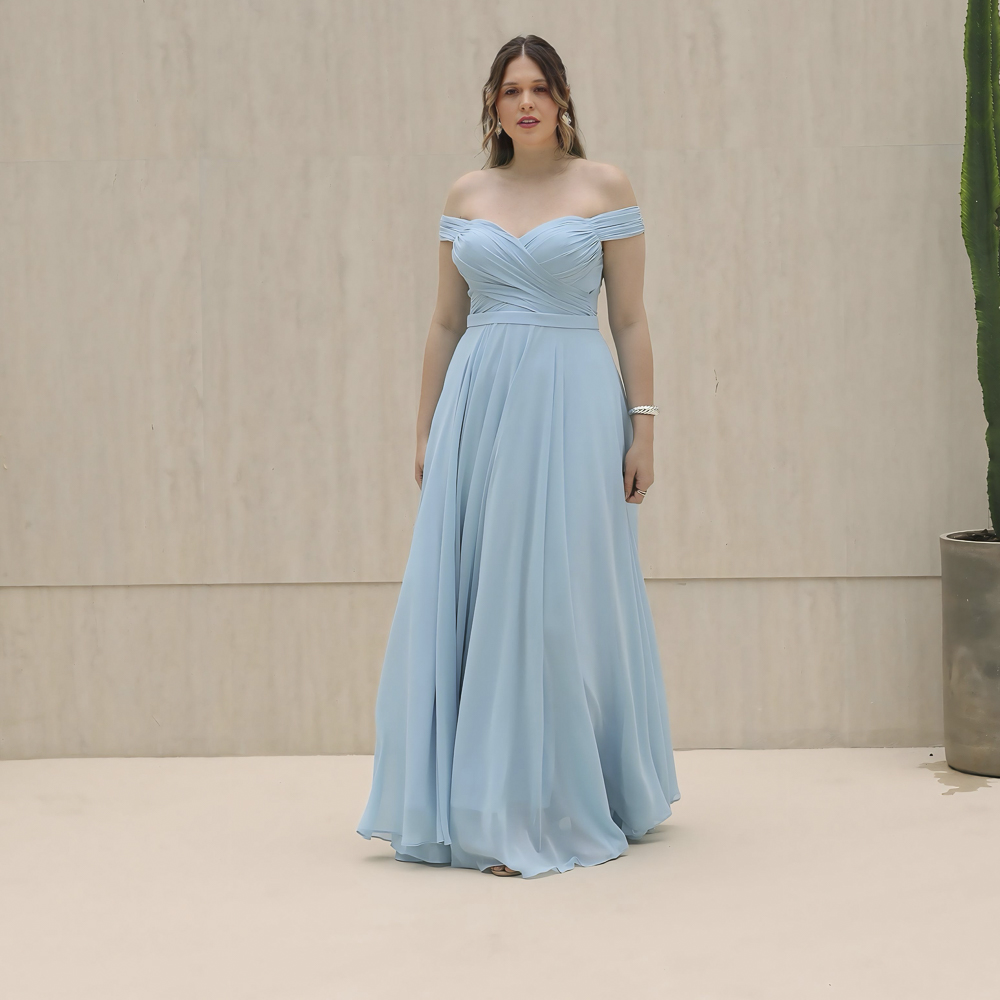 6181 – Vestido Leia Chiffon ombro a ombro e saia rodada – 44 46 48 – Azul Céu